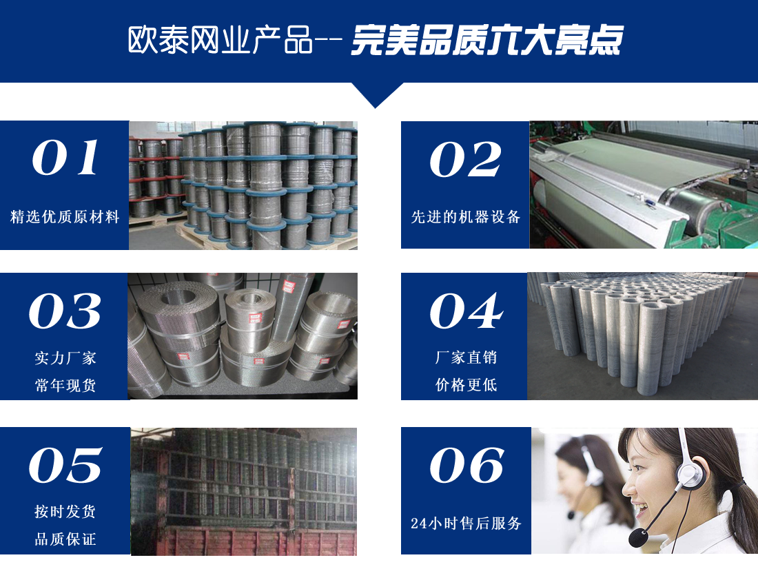 河北省安平縣歐泰五金網(wǎng)業(yè)有限公司座落于聞名全國(guó)的絲網(wǎng)之鄉(xiāng)河北省安平縣,是一家集科研,生產(chǎn), 經(jīng)營(yíng),銷(xiāo)售為一體的綜合性企業(yè)。我廠(chǎng)技術(shù)力量雄厚,采用優(yōu)質(zhì)原材料,嚴(yán)把質(zhì)量關(guān),主要絲網(wǎng)產(chǎn)品:編織系列:不銹鋼 絲網(wǎng),鐵絲網(wǎng),電鍍鋅鐵絲網(wǎng),熱鍍鋅鐵絲網(wǎng),包塑鐵絲網(wǎng),窗紗,,輸送網(wǎng),合股網(wǎng),勾花網(wǎng),六角網(wǎng),石籠網(wǎng),銀絲,銀網(wǎng)。護(hù) 欄網(wǎng):護(hù)攔網(wǎng)、公路護(hù)欄網(wǎng),鐵路護(hù)欄網(wǎng),機(jī)場(chǎng)護(hù)欄網(wǎng),工廠(chǎng)防護(hù)網(wǎng),小區(qū)防護(hù)網(wǎng),電焊網(wǎng),電焊網(wǎng)片,聚脂網(wǎng)系列:聚脂成型 網(wǎng)、聚脂單絲干網(wǎng)、印刷網(wǎng)。金屬板網(wǎng):鋼板網(wǎng)、鎳板網(wǎng),鋁板網(wǎng),沖孔網(wǎng)主要應(yīng)用于工業(yè),石油,化工,建筑,紡織,醫(yī) 藥,航天,航空,養(yǎng)殖,冶金機(jī)械等多個(gè)領(lǐng)域,我廠(chǎng)技術(shù)力量雄厚,設(shè)備先進(jìn),檢測(cè)方法齊全,產(chǎn)品質(zhì)量穩(wěn)定....